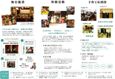 −毎月開催− 〈会員限定〉寺子屋 わくわく子どもキッチン 〈だれでもきてね〉リラミック グリーンテラス −年間予定− 1月 【舞台】オーケストラファミリーコンサート 【体験】 もちつき 2月 【舞台】竹楽器づくりワークショップ 【体験】陶芸 伝統食「みそづくり」 色糸あそび(さき織物) 3月 【舞台】竹の音楽会 【体験】そつぎょうしきっちん 4月 【体験】 お花見 【ユース】てづくりぽっけ市 6月 【舞台】人形劇「オズの魔法使い」 7月 【舞台】人形づくり なつよるキッズえんにち 9月 【体験】親子キャンプ 10月 【体験】稲刈り 【セミナー】デンマークの保育に学ぶ 11月 【舞台】長谷川義史「絵本ライブ」 12月 【体験】クリスマス会 など 【舞台】・・・舞台鑑賞 【体験】・・・体験活動 【ユース】・・・若手アーティストによる出演、出店 |