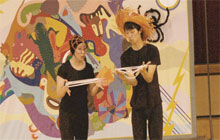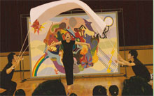 作品について あの小さなクモが糸を長くのばして気流に乗って高くどこまでも飛んでいくというお話を知った時はとても驚き、すごいと思いました。 それと、クモがあのレースのような素晴らしいアミ、ネットを編むことができるようになったのか とても不思議でした。 アミを編んでいてこんがらがって困ることはないのでしょうか。 きっとクモには私たちの知らないような知恵をもっていてそんなことができるのでしょうね。 民族や宗教や資源などいろいろな問題で対立し争い、なかなかテロや戦争がなくならないこの世界。 巻きこまれて犠牲になるのはいつも子供。 この作品は、そんな人間の絡み合った心の糸を何とかレースのように編み上げて、 平和で素敵な世界にならないものかと願って作り出した作品です。 作・演出 岡安伸治 |