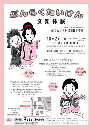 プロの義太夫、三味線、人形遣いの方々に よるわかりやすい文楽の解説、子ども対象の 人形つかい、三味線のワークショップなど。 いきなり劇場で文楽を観劇するのは 敷居が高いという大人の方も、ぜひお子さんや お孫さんと 伝統文化をおたのしみください。 |