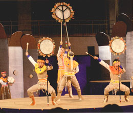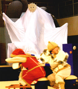 客席をとっぱらい、まぢかに組まれたステージは、登場人物の細やかな表情まで見逃さないほど。 子どもたちは宇宙イメージの舞台空間に身をおいて、自由に想像力をふくらませ見てもらいます。 真ん中の円形舞台は外側がくるくるとまわり、七変化するリズミカルな展開に、子ども達はくぎづけ! |