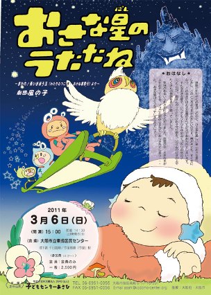 むかし、人は国の中で場所取りのたたかいをしていました。 すこしたつと、こんどは国と国が争うようになりました。 やがて、それがどんなに無駄でおろかなことか、そして世界が平和であることがどんなに大切かをたくさんの経験をとおして人々はやっと気づくようになりました。 でもこれからのみなさんの時代は、もっともっと大きな世界、私たちが住んでいるこの地球のことを考えなければなりません。 なぜって、私たちみんな地球の子だからです。 (中略) いつもいねむりばかりしているような目立たない普通の男の子が、どうして大きな力を発揮できたか、そしてどうやってこのおさな星をすくったのでしょう。 その答えは、この劇を見て、どうかあなた自身で見つけて下さい。 うたたねはだれでもない、あなたなのですから。 未来に生きるあなたの心にいつまでも美しい魔法玉がまわり続けますように。 |