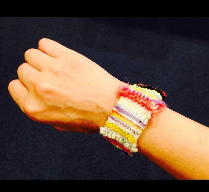 さをり織り体験 通常サイズの織り機でT マット(15cm 幅)、子どもサイズの織り機でリストバンド。
